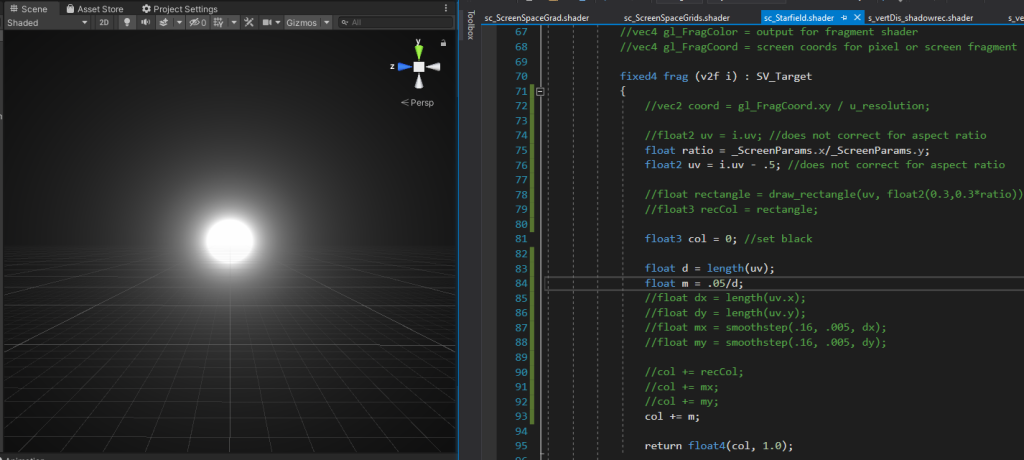 I found some good star shaders for references online, stumbling across the Shadertoy site which Ive seen many times in the past. But the issue is that these shaders are in pure GLSL, whereas Unity uses HLSL (similar but different). Knowing these languages are very similar and after some poking around I discovered how to translate Shadertoy shaders to Unity! (huge thanks to The Art of Code for this great tutorial on the topic. Theres still some tricky bits of conversion I havent been able to work out for some shaders, so it doesnt work for everything, but this does mean I’m able to mess around with a huge repository of shaders for my Unity-based games.