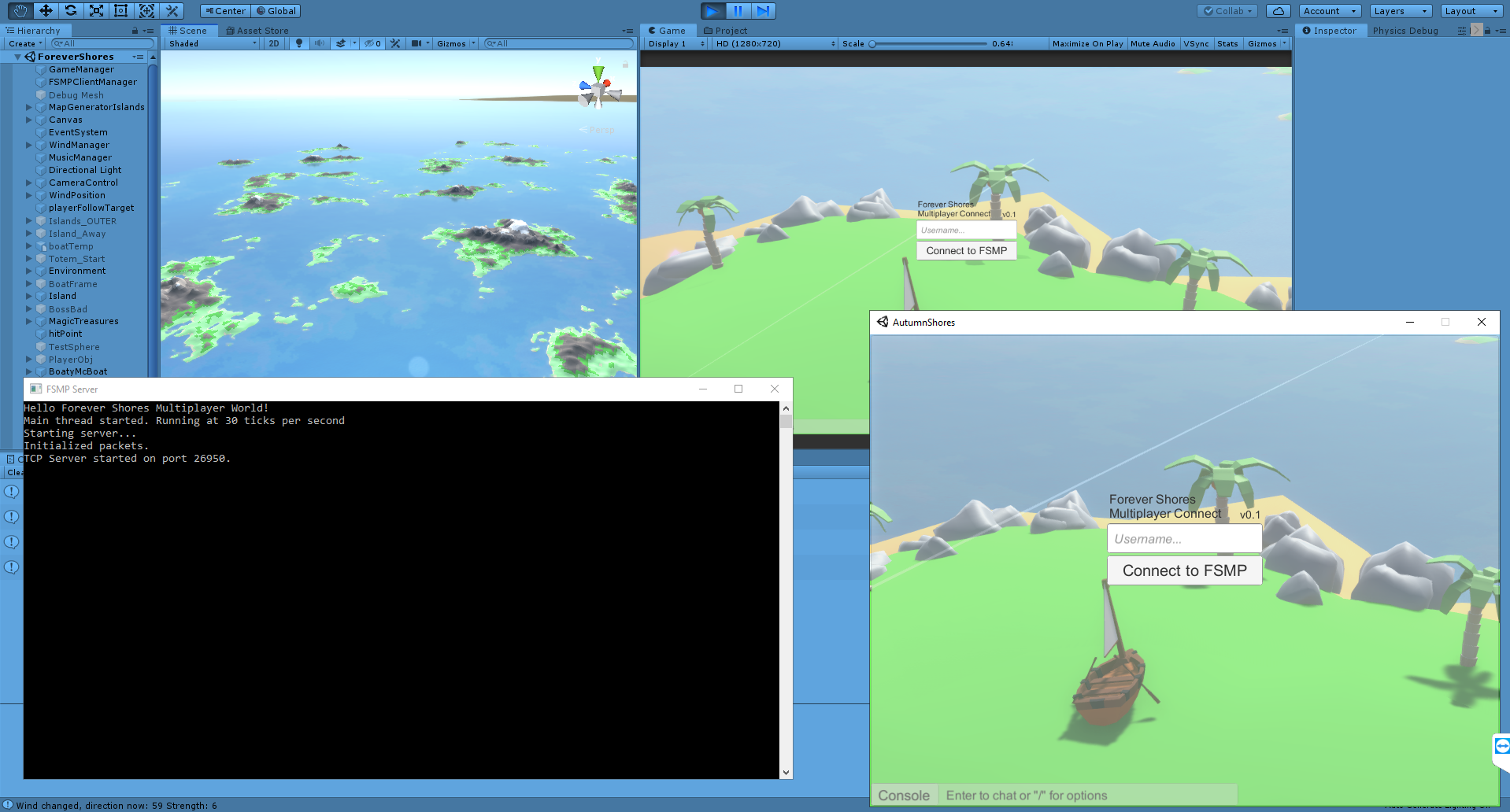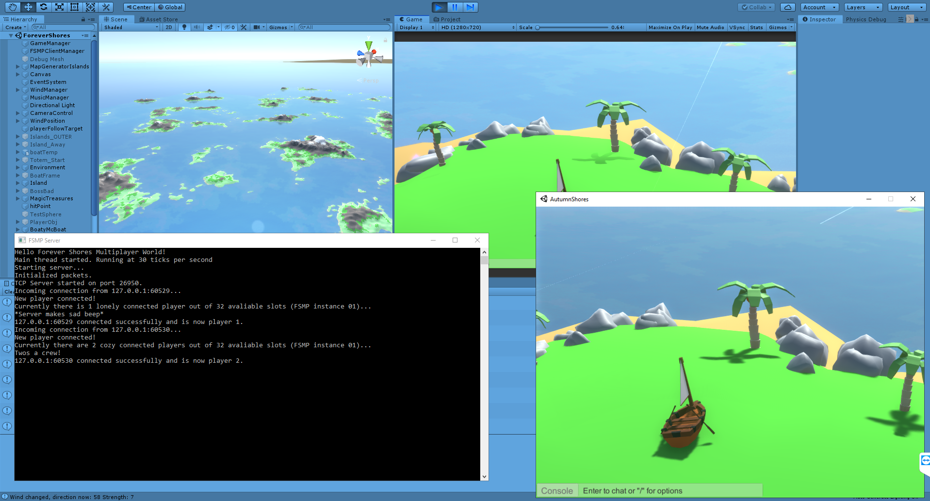 Finally the 3rd major area of work this past 10 days (and what I spent the most of my dev time on) was on my experimental project ‘Forever Shores’, which is the continuation of my Ludum Dare 44 sailing game ‘Autumn Shores’. Ive been wanting to experiment with adding multiplayer to a game for a while now, so thats what I started!