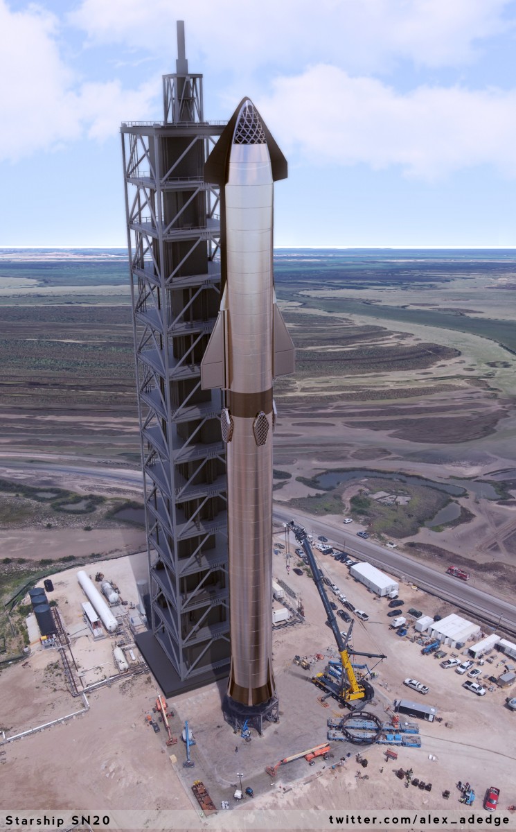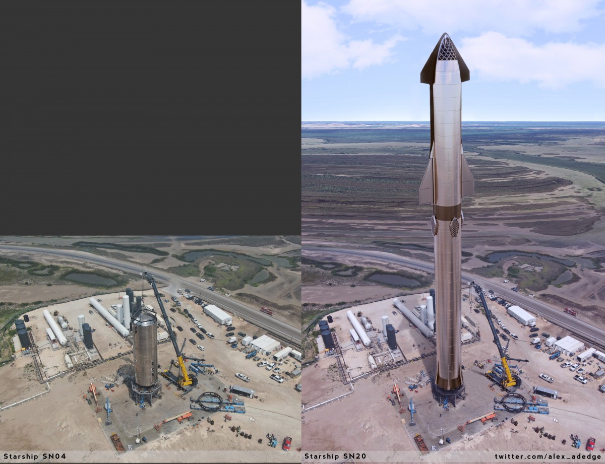 And an alternate version without the launch tower – in the image below you can also compare it to the original photo (left) taken/posted by Elon Musk and my edit (right) where Ive added in the full vehicle (and some of the background) to get a real feeling of how big this rocket will be: