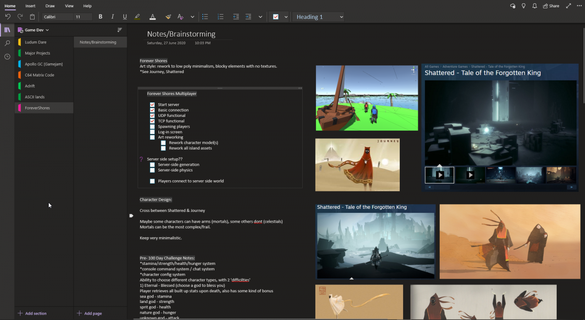 Additionally Ive started using OneNote much more, and Ive found is perfect for my style of note taking, brainstorming of ideas and just in general organizing thoughts. You can also use it for checklists, but I think I still prefer Trello for task tracking, even if a bit is creeping into OneNote as well.. It feels good though, to finally have a note & task taking solution which I feel works across all the types of projects I work on (plus both programs are avaliable at all times on my phone for when Im away from my PC)