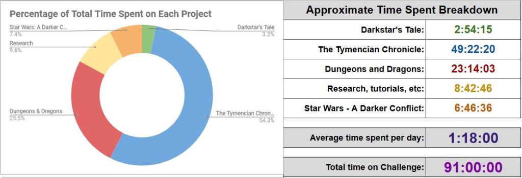 We’ve finally hit 90+ hours of work put into this challenge. Hoping to clear 120 hours by day 100, but we’ll see. My average time spent is still dropping unfortunately.